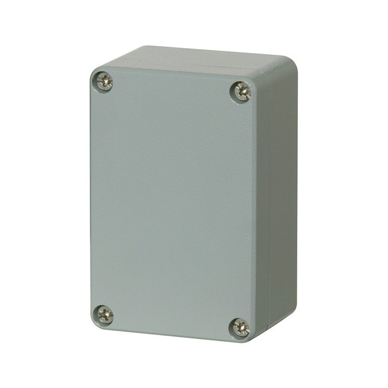 Caja de aluminio de color gris RAL 7031, tapa opaca y cierre por tornillos de acero inoxidable, con junta IP 66