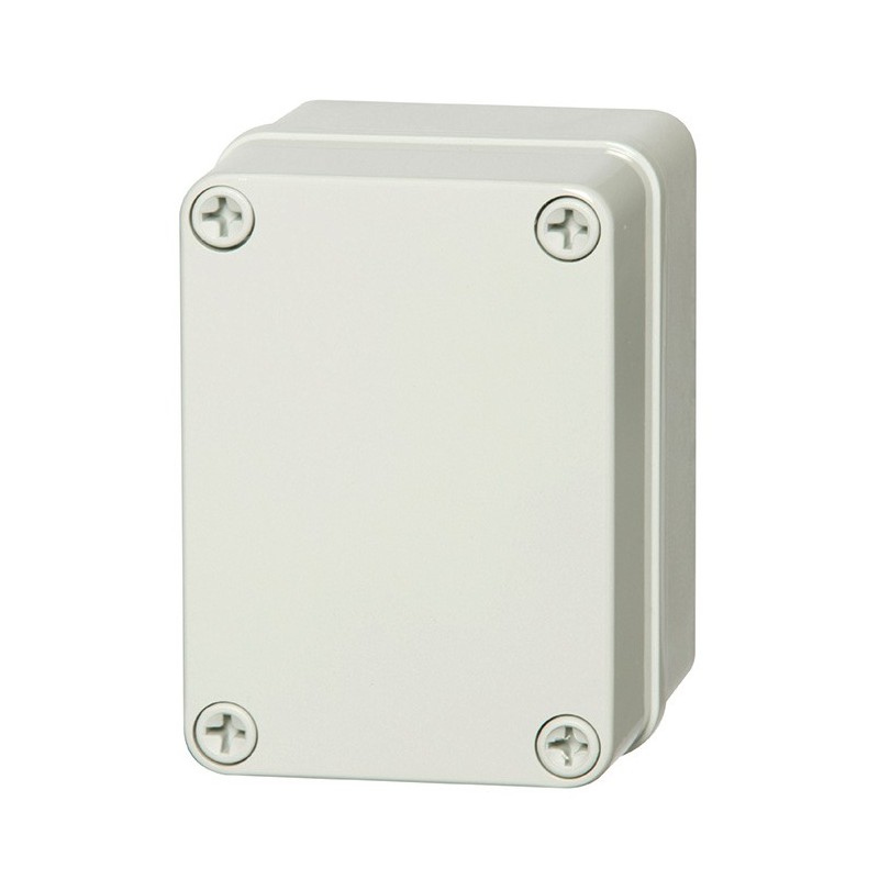 Caja de ABS, con tapa opaca y cierre por tornillos de poliamida. Incluye junta de goma para obtener IP 66. Color gris RAL 7035.