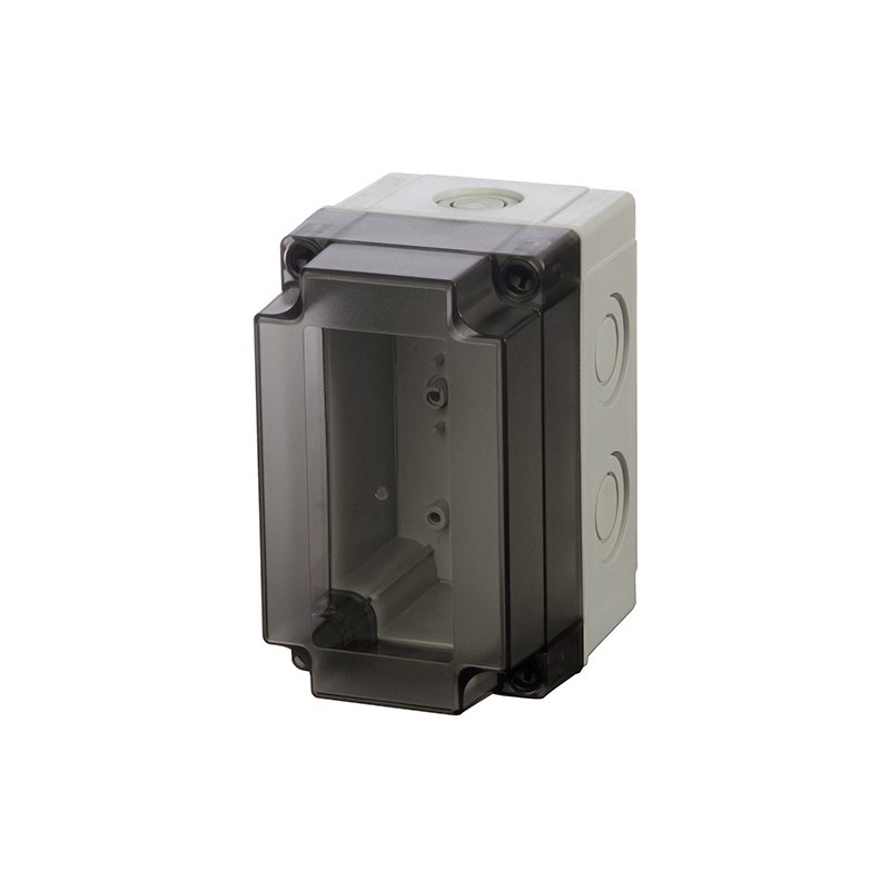 Caja de policarbonato con base de 50 mm de altura, y tornillos para placa de montaje/carril DIN. Con tapa transparente preparada para teclados de membrana, cierre con tornillos de poliamida, y junta de goma para IP 66. De color gris RAL 7035.