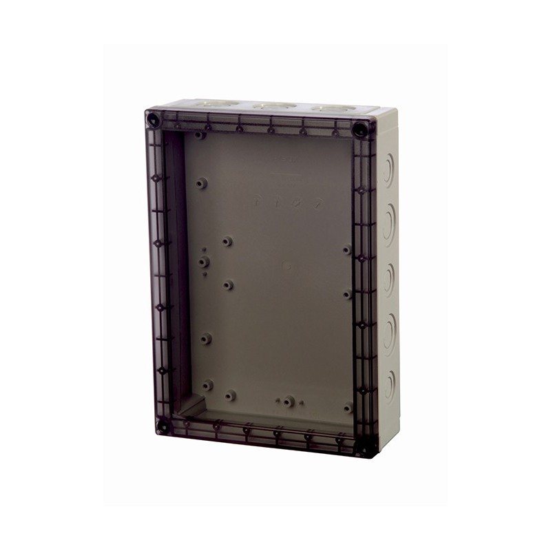 Caja de policarbonato con base de 50 mm de altura, y tornillos para placa de montaje/carril DIN. Con tapa transparente preparada para teclados de membrana, cierre con tornillos de poliamida, y junta de goma para IP 66. De color gris RAL 7035.