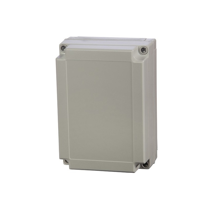Caja de policarbonato con base de 50 mm de altura, y tornillos para placa de montaje/carril DIN. Con tapa opaca preparada para teclados de membrana, cierre con tornillos de poliamida, y junta de goma para IP 66. De color gris RAL 7035.