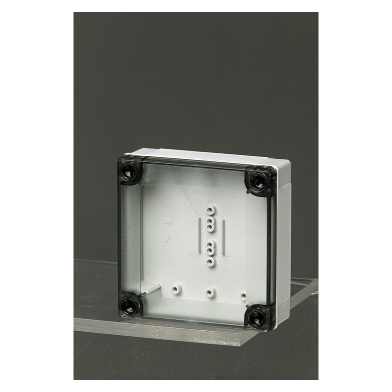 Caja de policarbonato con base de 25 mm de altura, y tornillos para placa de montaje/carril DIN. Con tapa transparente preparada para teclados de membrana, cierre con tornillos de poliamida, y junta de goma para IP 66. De color gris RAL 7035.
