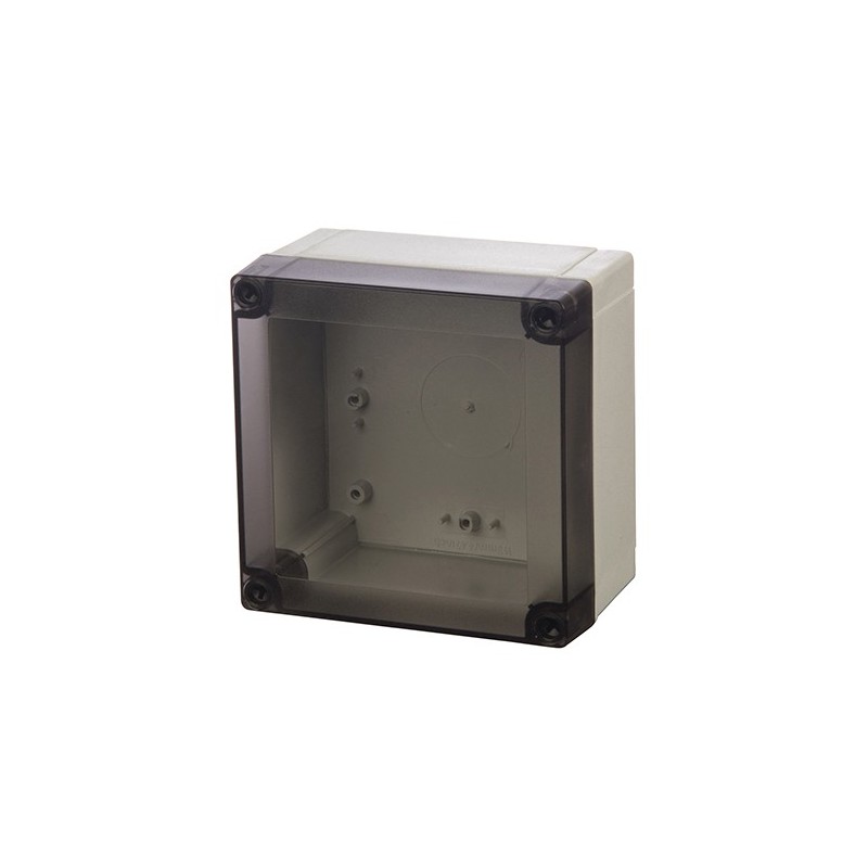 Caja de policarbonato con base de 50 mm de altura, y tornillos para placa de montaje/carril DIN. Con tapa transparente preparada para teclados de membrana, cierre con tornillos de poliamida, y junta de goma para IP 66. De color gris RAL 7035.