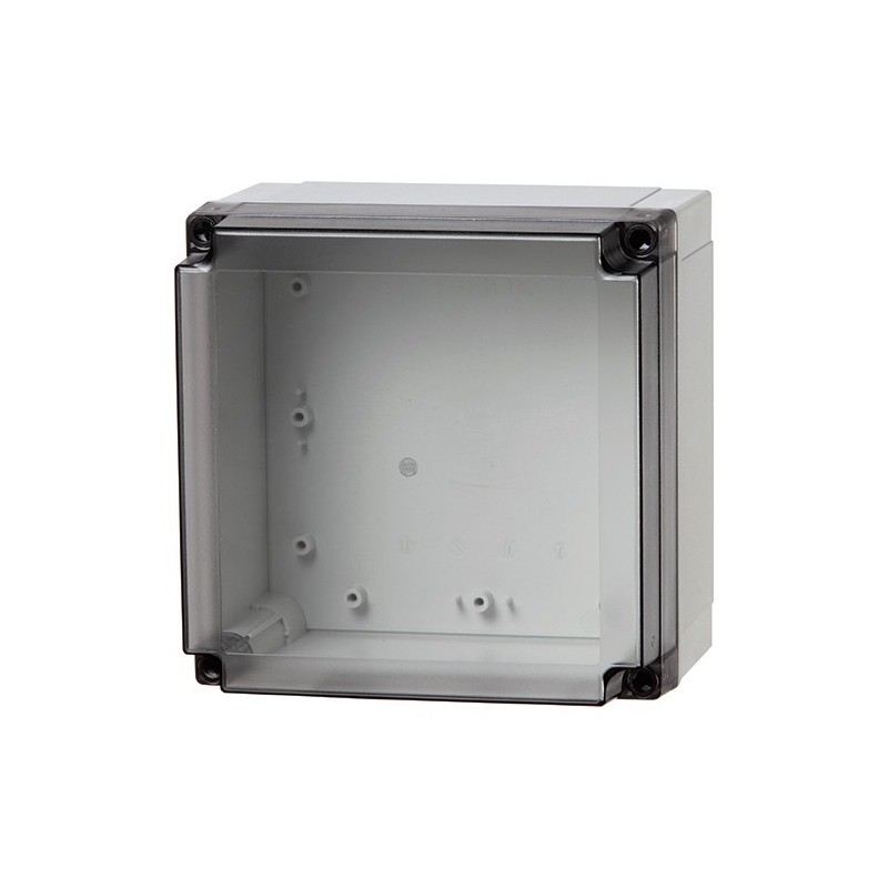 Caja de policarbonato con base de 50 mm de altura, y tornillos para placa de montaje/carril DIN. Con tapa transparente preparada para teclados de membrana, cierre con tornillos de poliamida, y junta de goma para IP 66. De color gris RAL 7035.