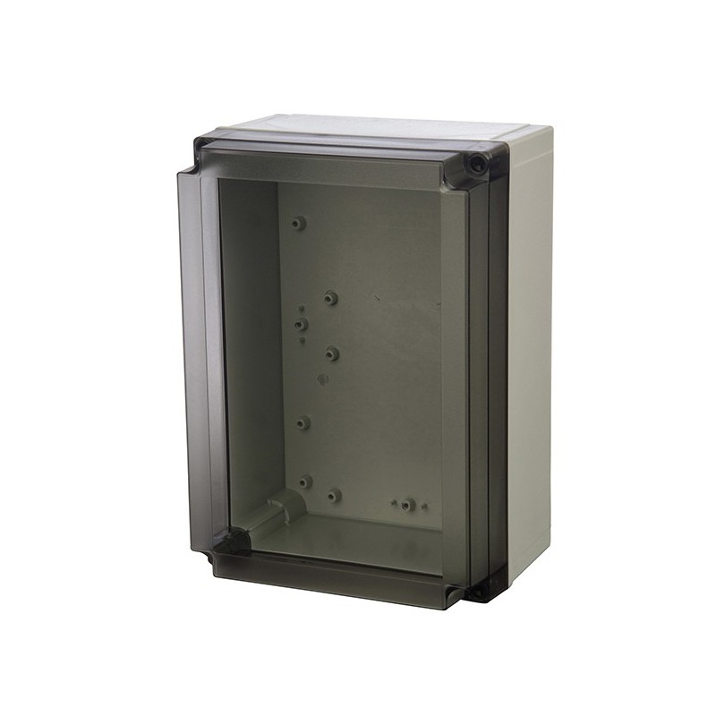 Caja de policarbonato con base de 75 mm de altura, y tornillos para placa de montaje/carril DIN. Con tapa transparente preparada para teclados de membrana, cierre con tornillos de poliamida, y junta de goma para IP 66. De color gris RAL 7035.