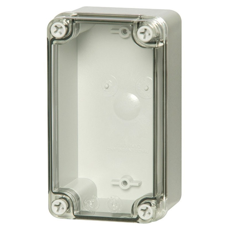 Caja de policarbonato, con tapa transparente y cierre por tornillos de poliamida. Incluye junta de goma para obtener IP 66. Color gris RAL 7035.