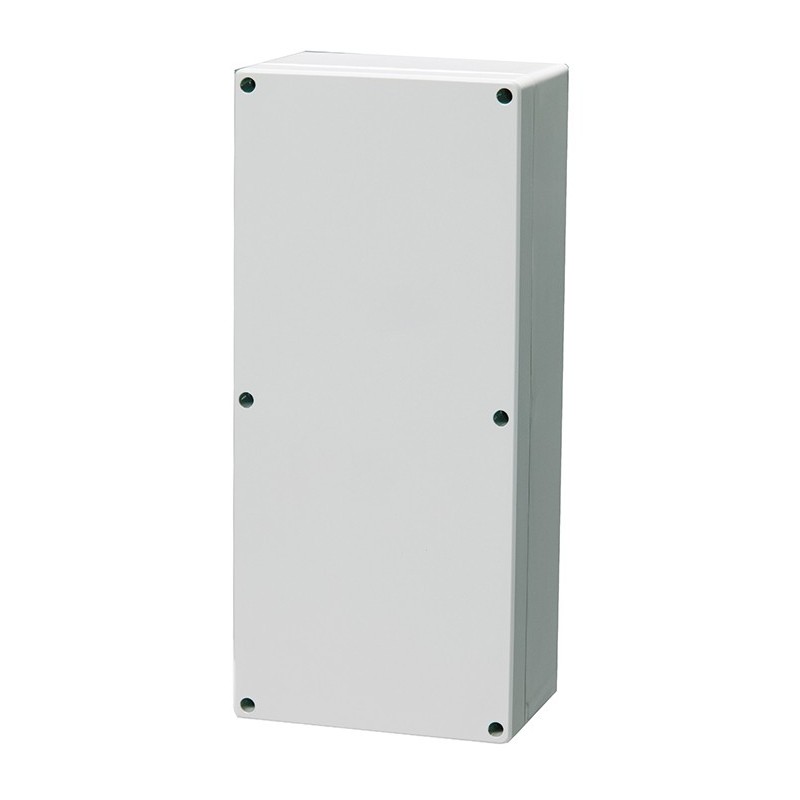 Caja de policarbonato, tapa opaca y cierre por tornillos de acero inoxidable, con junta de goma para IP66. Color gris RAL 7035.