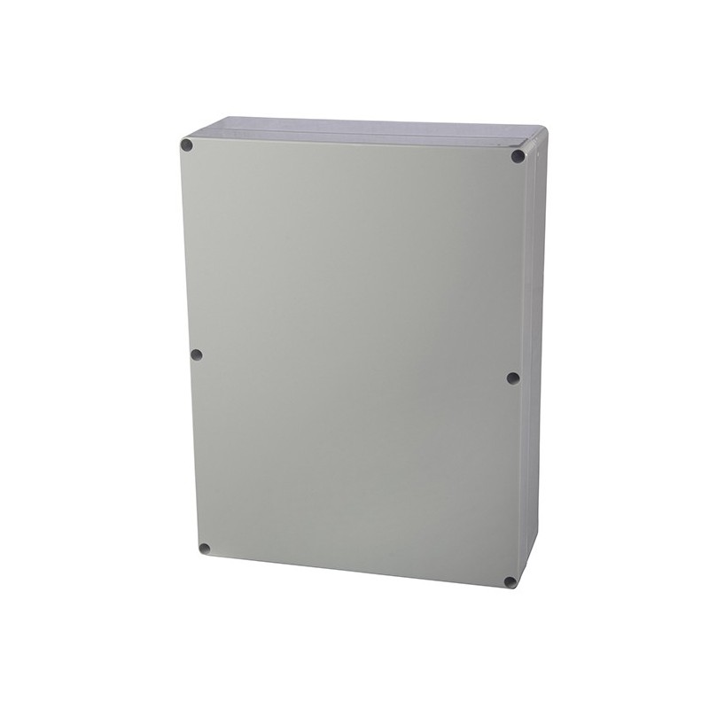 Caja de policarbonato, tapa opaca y cierre por tornillos de acero inoxidable, con junta de goma para IP66. Color gris RAL 7035.