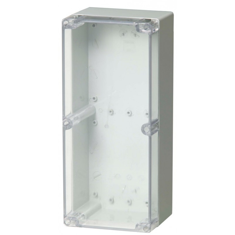 Caja de policarbonato, tapa transparente y cierre por tornillos de acero inoxidable, con junta de goma para IP66. Color gris RAL 7035.