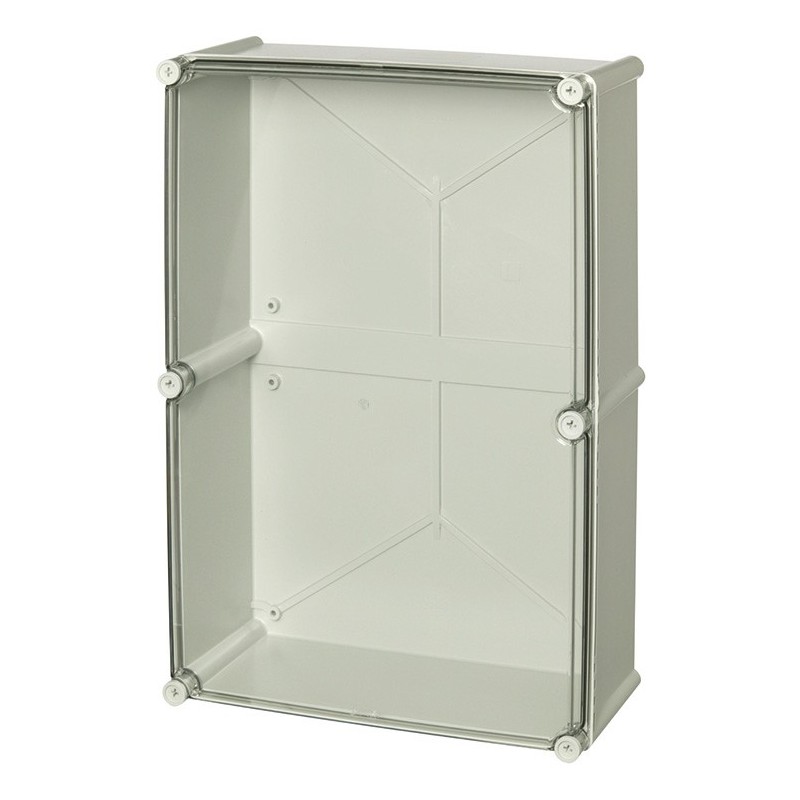 Caja de policarbonato con tapa transparente y cierre por tornillos de plástico, con junta de goma para IP 66. Color gris RAL 7035.