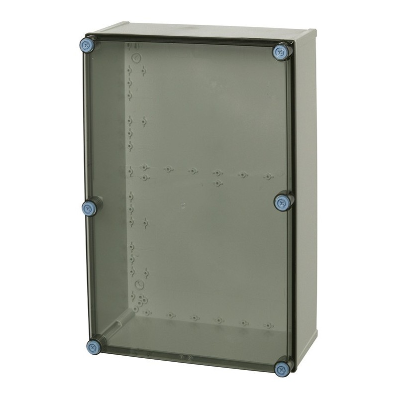 Armario de policarbonato de color gris RAL 7035, tapa transparente y cierre rápido. Con junta de goma para IP 66