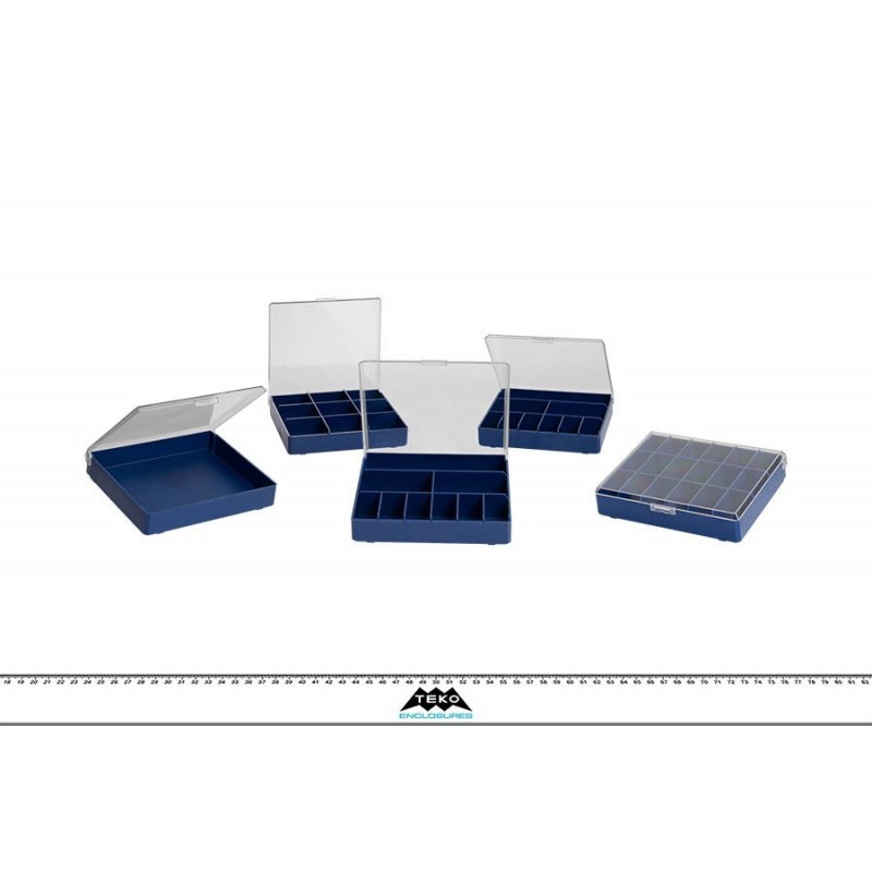 Caja con tapa transparente, y base de color azul. Incluye compartimentos interiores.