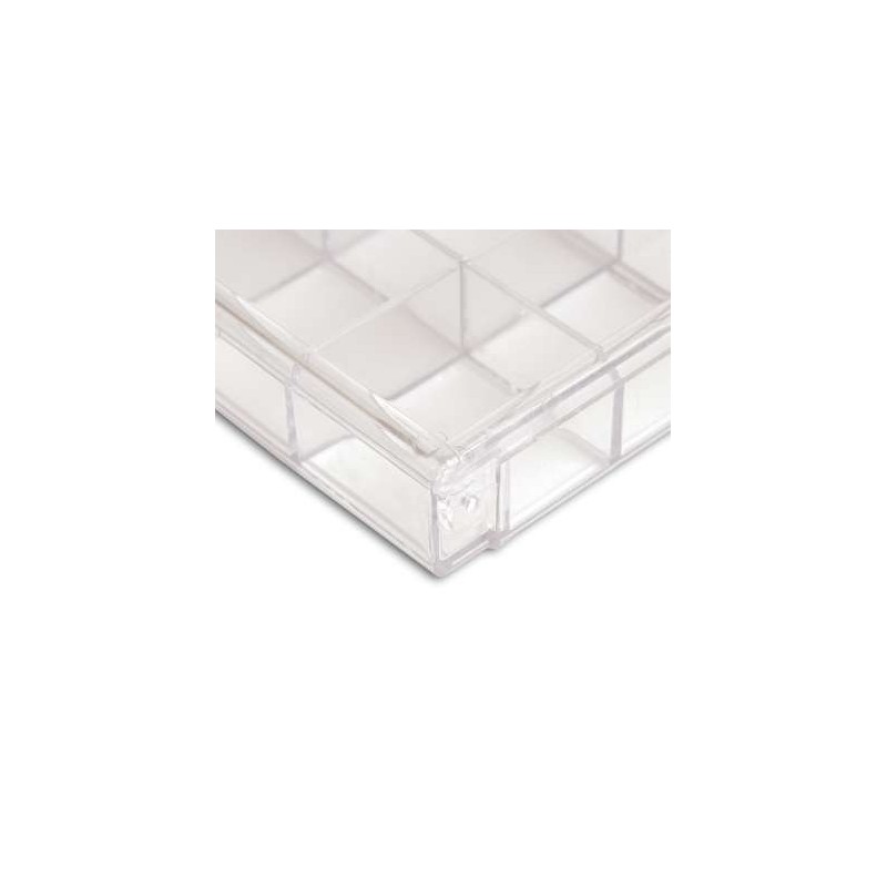 Caja con tapa y base transparente. Incluye compartimentos interiores.